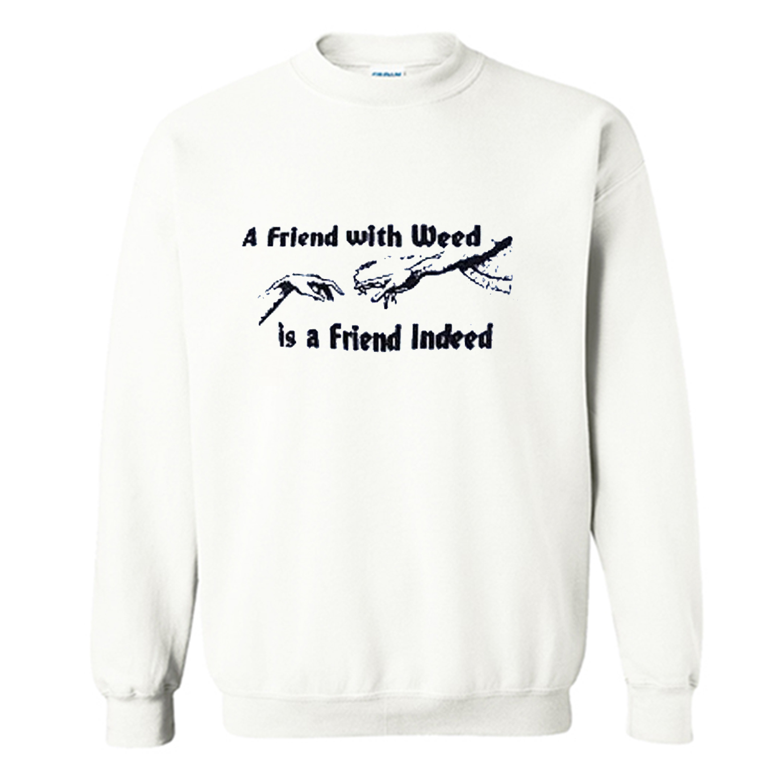We use DTG Technology to print A FRIEND WITH WEED is a Friend Indeed Sweatshirt (BSM).