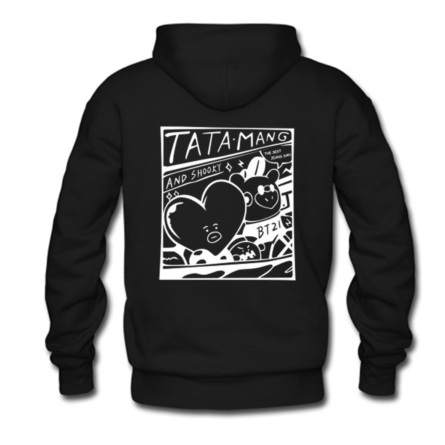We use DTG Technology to print BT21 Tata Mang V Jimin Black Hoodie (BSM).