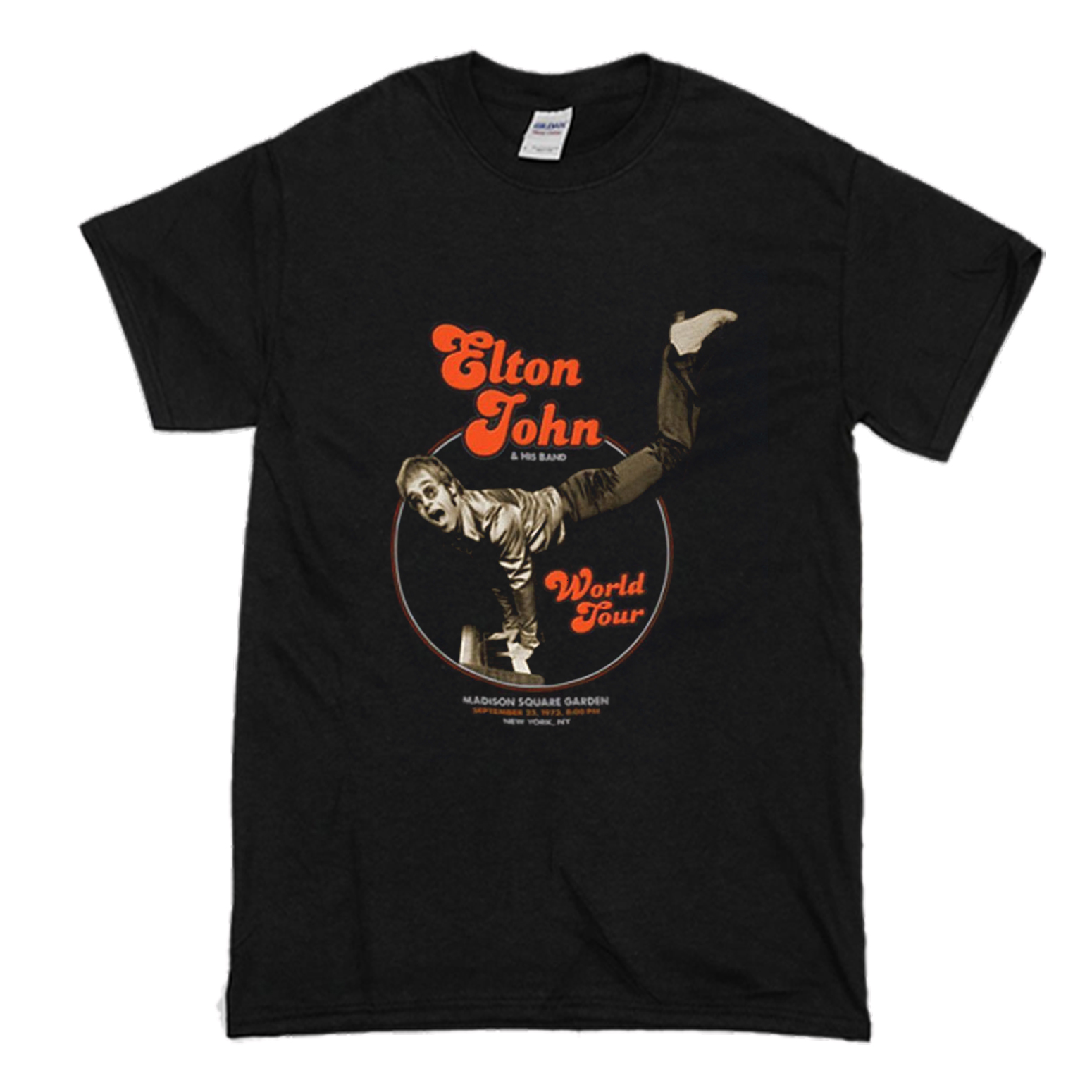 We use DTG Technology to print Elton John World Tour Piano Handstand T Shirt (BSM) .