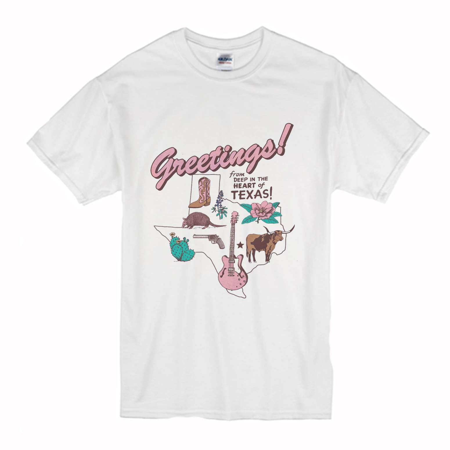 We use DTG Technology to print Greetings Texas T Shirt (BSM) .
